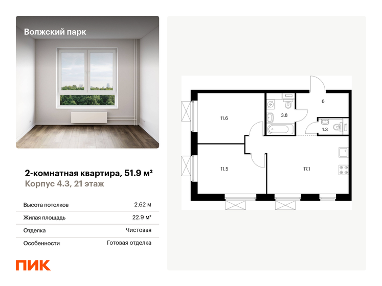 Продаётся 2-комн.квартира площадью 52.10 кв.м на 17 этаже 23 этажного дома (Корпус 4.3, секция 1) проекта ПИК Волжский парк. Светлый просторный подъезд на уровне земли, функциональная планировка, большие окна, с отделкой.