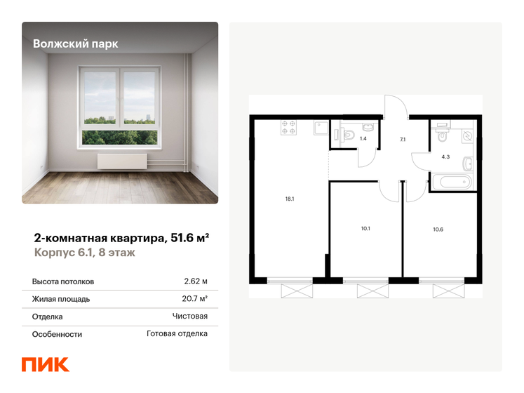 Продаётся 2-комн.квартира площадью 51.60 кв.м на 11 этаже 15 этажного дома (Корпус 6.1, секция 2) проекта ПИК Волжский парк. Светлый просторный подъезд на уровне земли, функциональная планировка, большие окна, с отделкой.