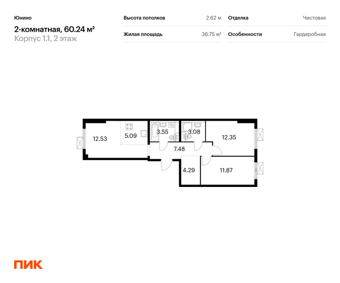 Продаётся 2-комн.квартира площадью 60.24 кв.м на 10 этаже 17 этажного дома (Корпус 1.1, секция 1) проекта ПИК Юнино. Светлый просторный подъезд на уровне земли, функциональная планировка, большие окна, с отделкой.